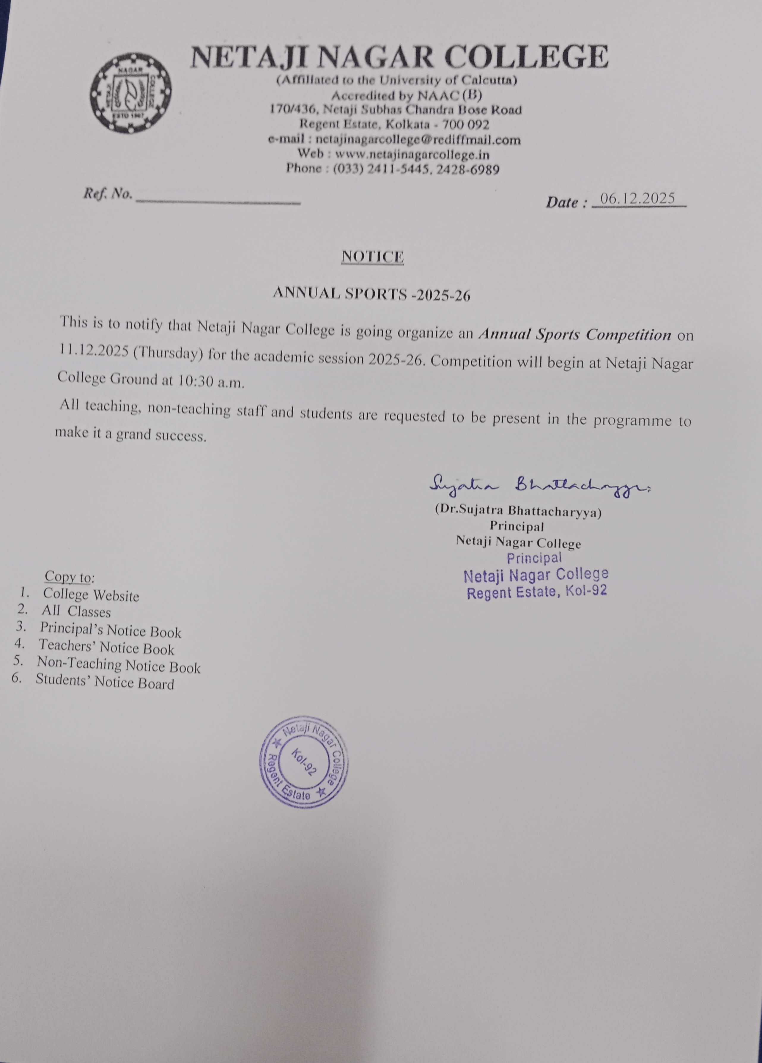 Notice for Class Annual Sports 2025-26